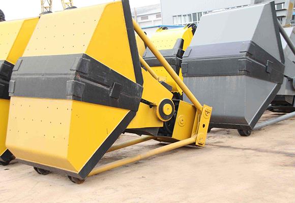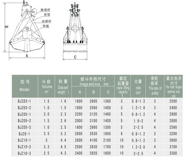 The hálf-skæri tegund grípa er eins konar hrífandi langur stöng grípa og klippa tegund grípa, og samsetning af tveimur kostum, svo sem framhandlegg, hreyfanlega stífur, truflanir stöng og kjálka, o.fl. Mið löm í framhandlegg er hengdur í annarri endi framhliðarinnar á miðlægum löm í kjálkaplötunni og hinn endinn er búinn rennihjól. Rennihjólið er lyft með aðgerðinni þannig að kjálka sé lokað, grípa efni og grípaþrýstingurinn er sterkur. Það er auðvelt að opna, og það er hentugt til meðhöndlunar á lausu efni eins og gult sand, kol, sandduft og stálblástur fyrir einn reipi og tvöfalt reipi.