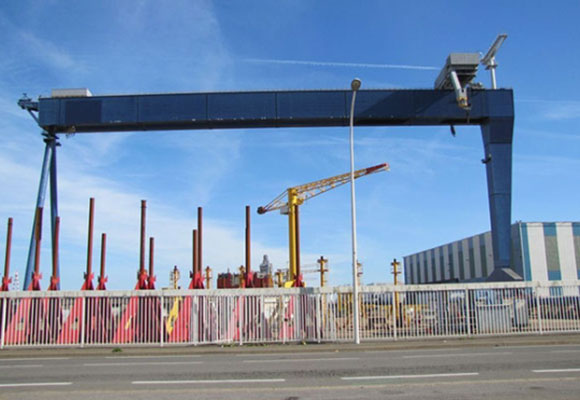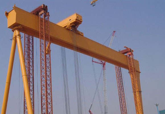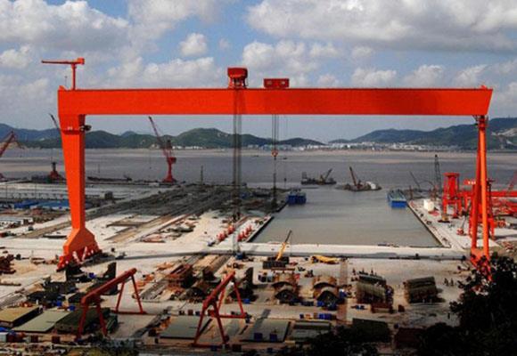 Skipakappakran sem notaður er í stað framleiðslu skips og bryggju, er það verkefni þess að setja allar hlutar sem þarf til framleiðslu á skipinu (rifbein, stál, stál osfrv.) Frá jörðu flutningi til framleiðslustaðar. Þessi flutningsvinna verður að geta lokið verkefninu á mjög langt ferðalagi í flutningi fljótt. Þess vegna ákvarðast fjöldi krana, nóg til að ná til bryggju svæðisins á öllu grunninum og hver krana truflar gagnkvæmt hvort annað.